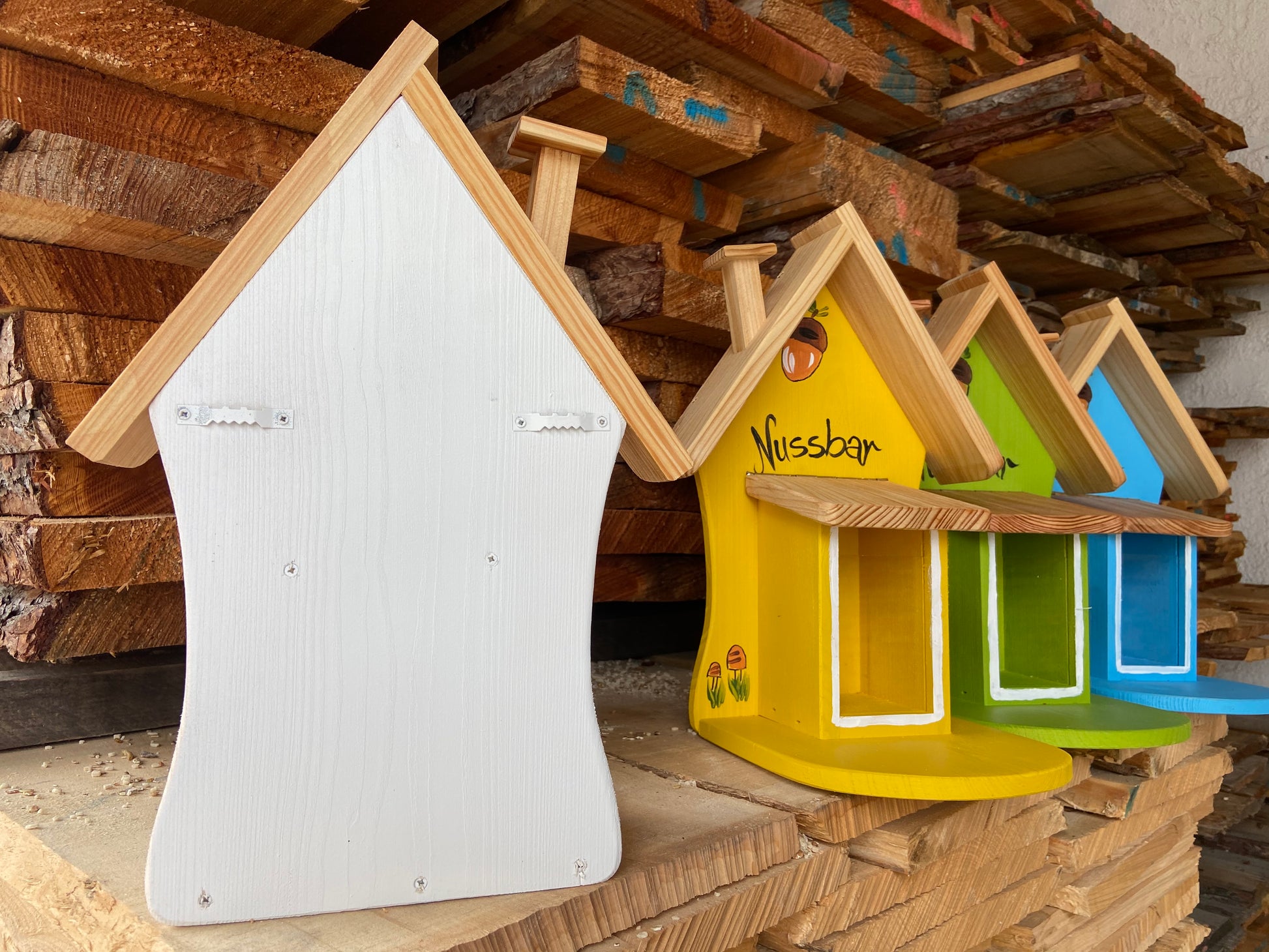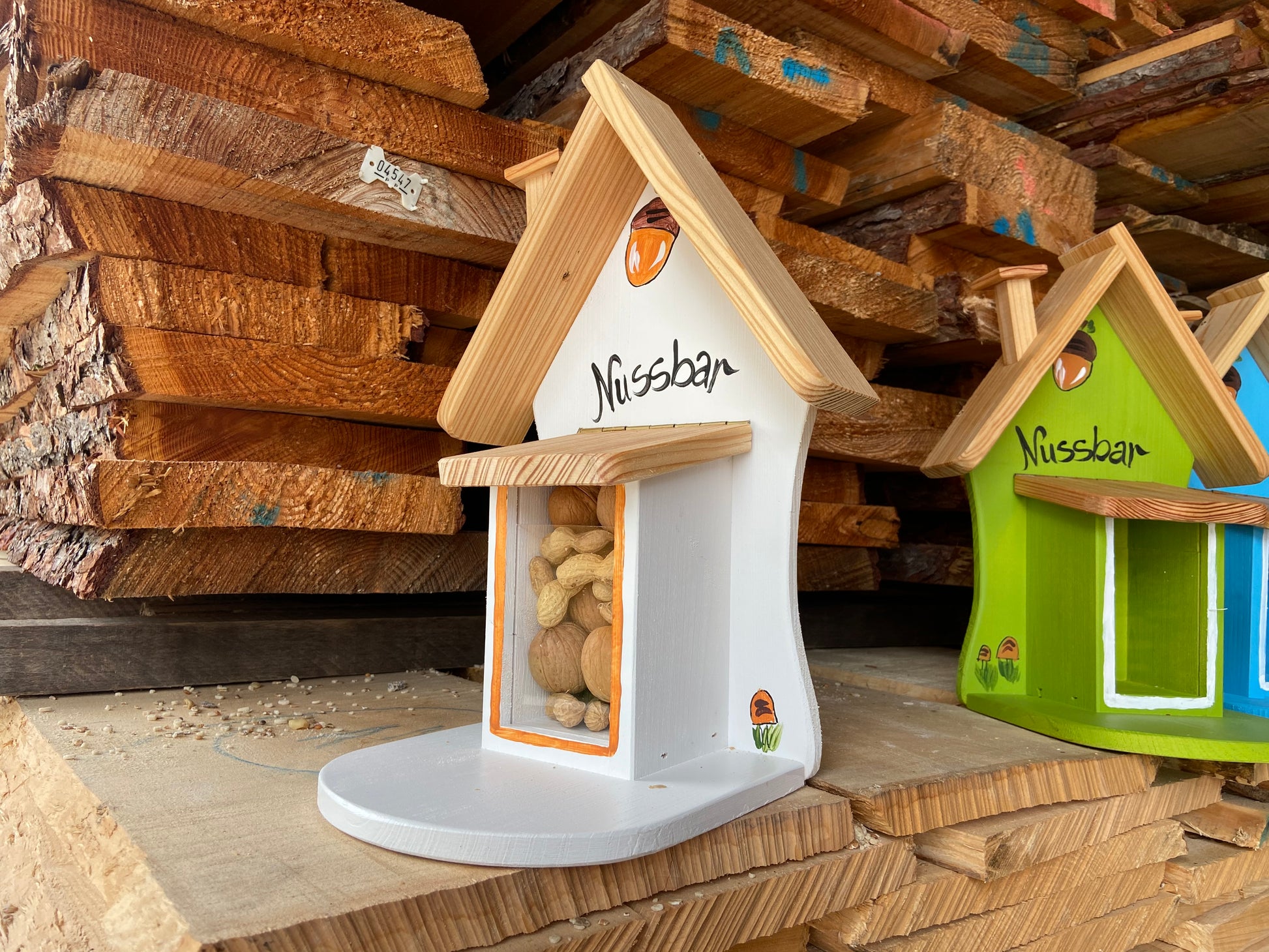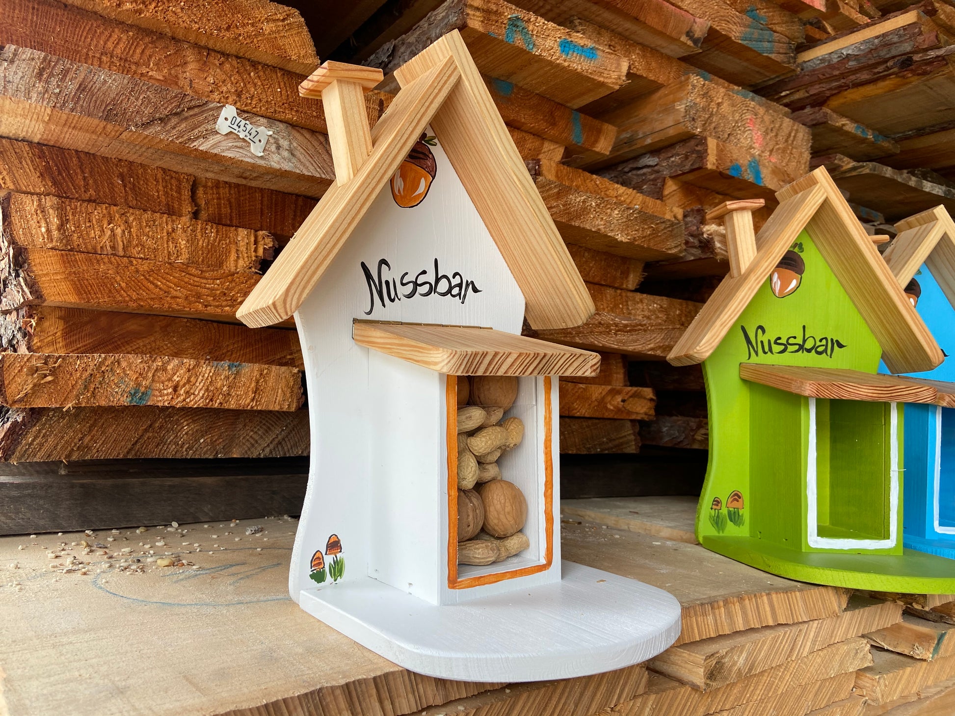 Die Nussbar wurde mit einer wetterfesten Farbe auf Wasserbasis behandelt – sie dürfte nicht erneut lackiert werden, da Lack oder Lösungsmittel die Tiere vertreiben könnten.