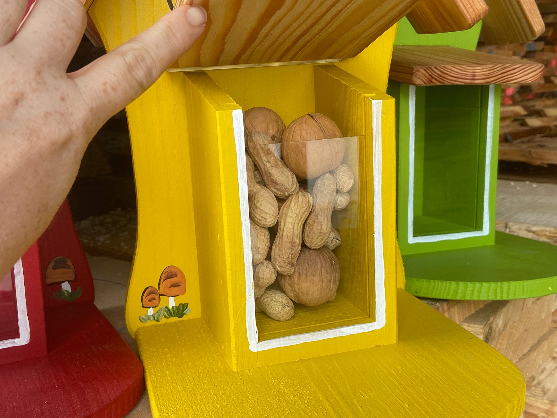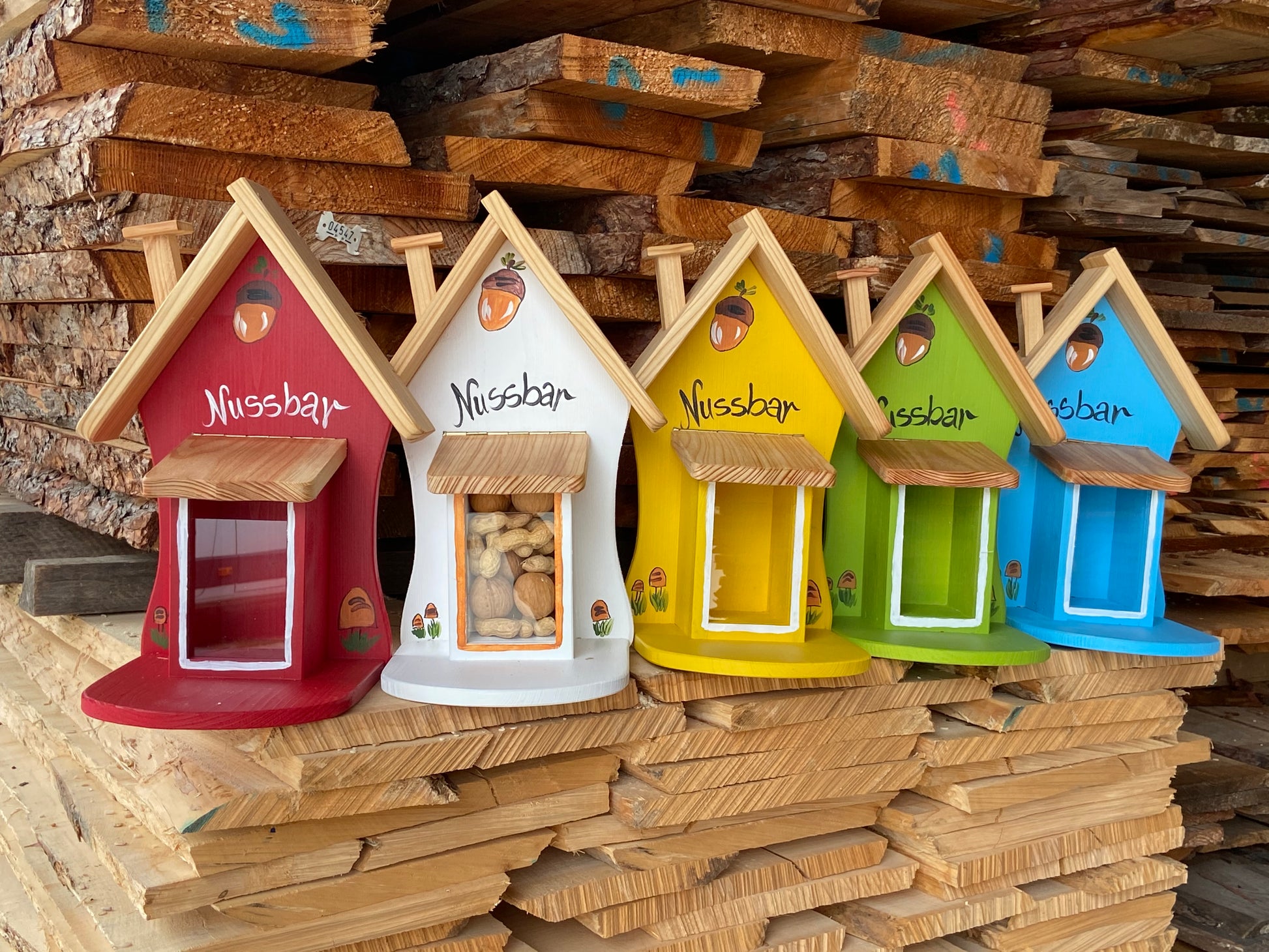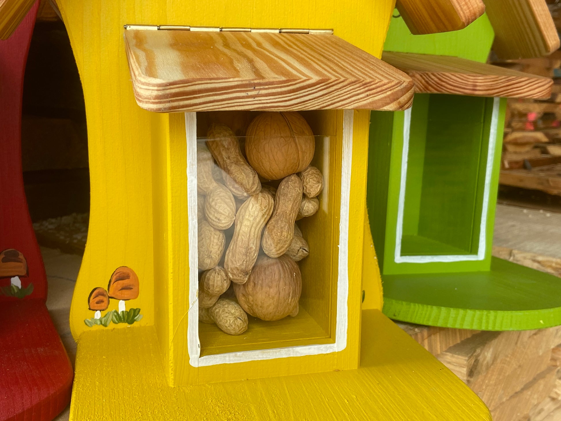 Die Nussbar wurde mit einer wetterfesten Farbe auf Wasserbasis behandelt – sie dürfte nicht erneut lackiert werden, da Lack oder Lösungsmittel die Tiere vertreiben könnten.